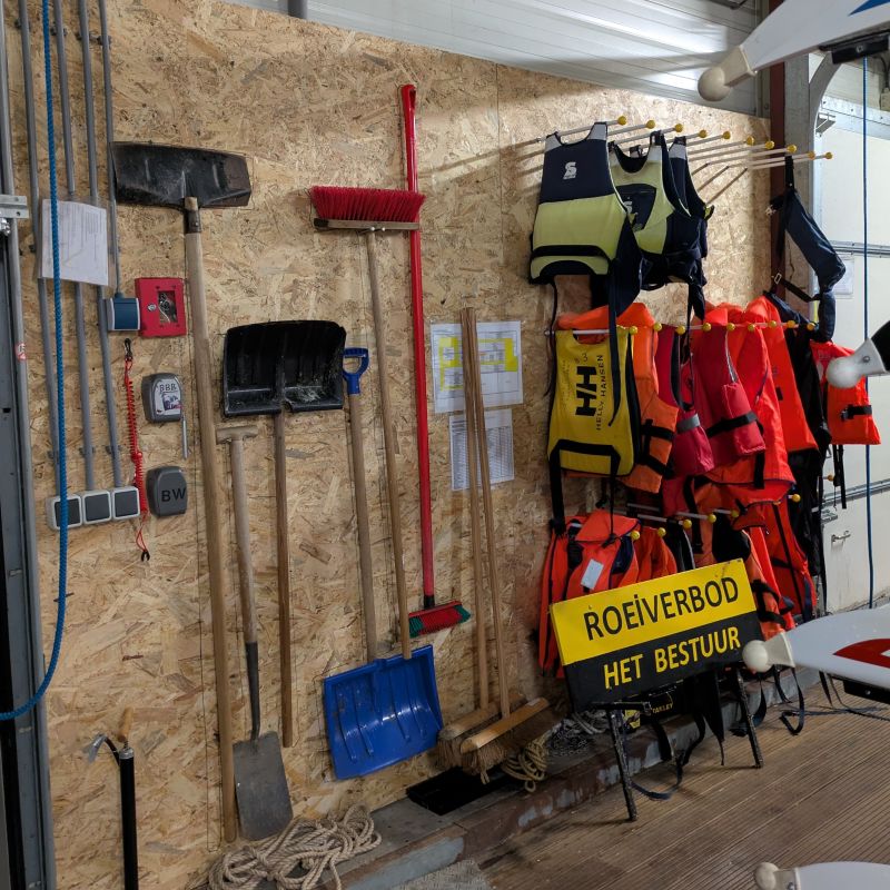 Zoals jullie al was opgevallen kun je sinds de laatste ALV de zwemvesten eindelijk netjes ophangen. Nu is ook de voorwand links daarvan van vezelplaat voorzien en heeft het meeste tuin-, zeg maar vlotgereedschap daar een plekje gekregen. Maar ook de sleutelkluisjes voor de botenwagens en het Rode nood kluisje met sleutels voor de Hoevercat en Rustig Rollen hebben daar een nieuwe plek gevonden. Allemaal wat beter bereikbaar. Wat er nog ontbreekt is iets van begeleidende tekst/attendering. Die volgt spoedig!'